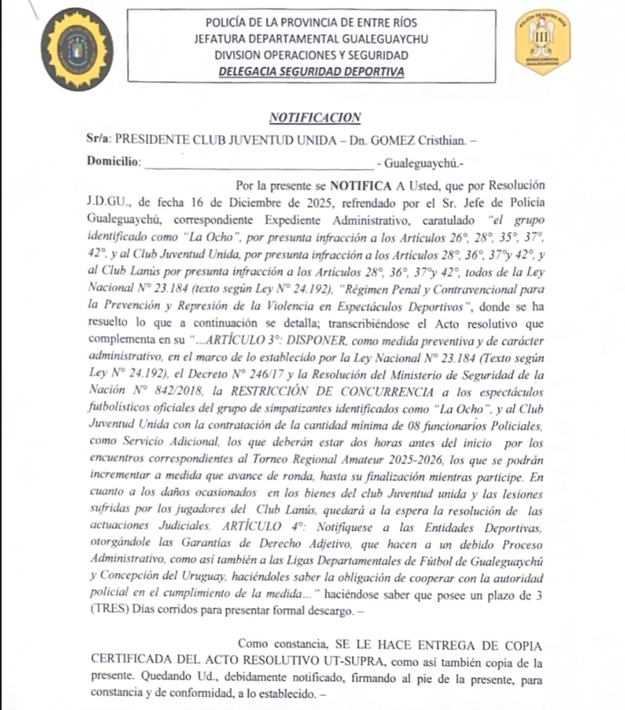 La Policía de la Provincia de Entre Ríos comunicó oficialmente a Juventud Unida que el grupo de simpatizantes identificado como “La ocho” no podrá ingresar al estadio en el encuentro que se disputará el próximo domingo. La decisión se enmarca en una medida preventiva adoptada luego de los incidentes registrados en el partido frente a Lanús de Concepción del Uruguay.