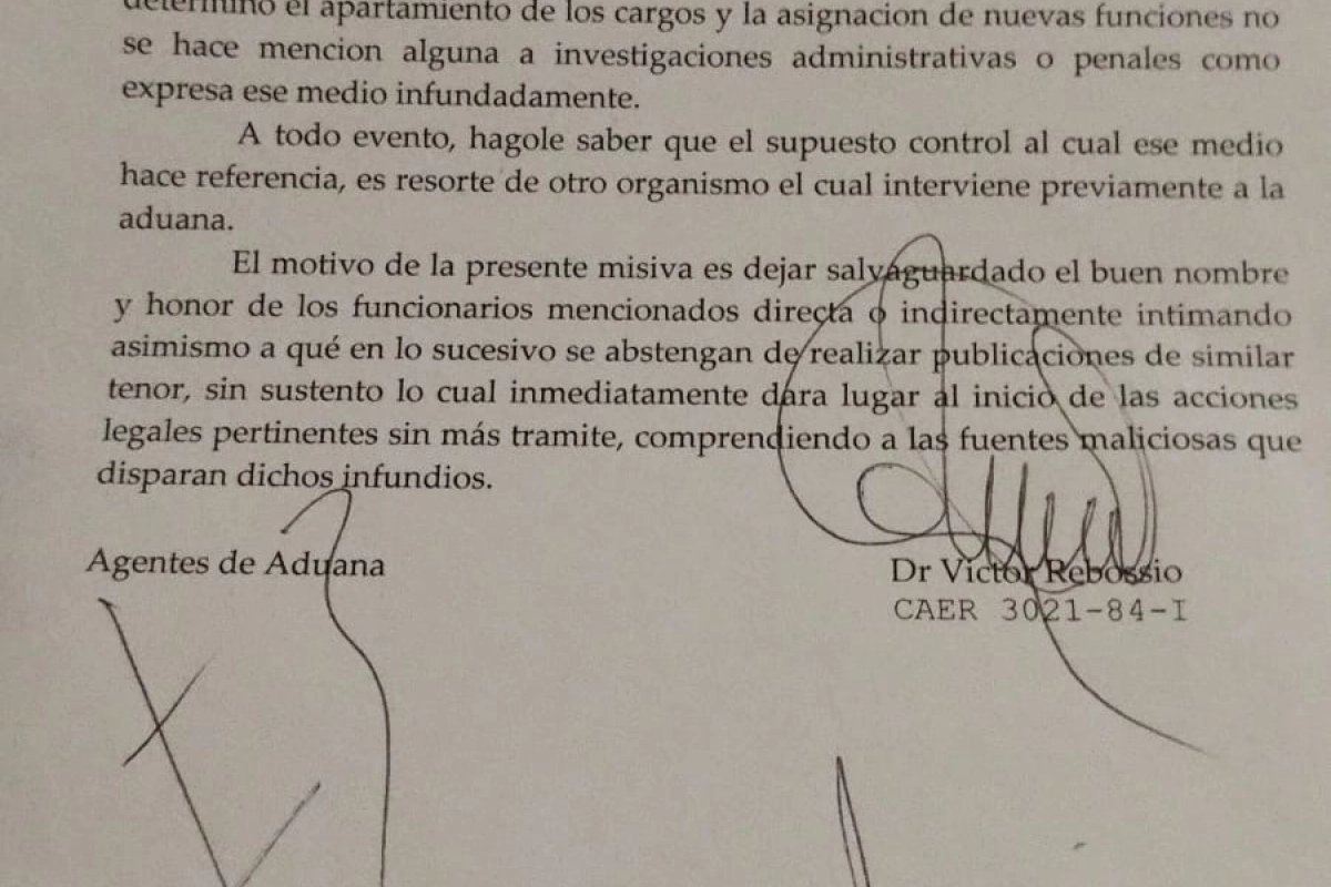 El motivo de la presente misiva es dejar salvaguardado el buen nombre y honor de los funcionarios mencionados directa o indirectamente intimando asimismo a qué en lo sucesivo se abstengan de realizar publicaciones de similar tenor, sin sustento lo cual inmediatamente dara lugar al inicio de las acciones legales pertinentes sin más tramite, comprendiendo a las fuentes maliciosas que disparan dichos infundios.