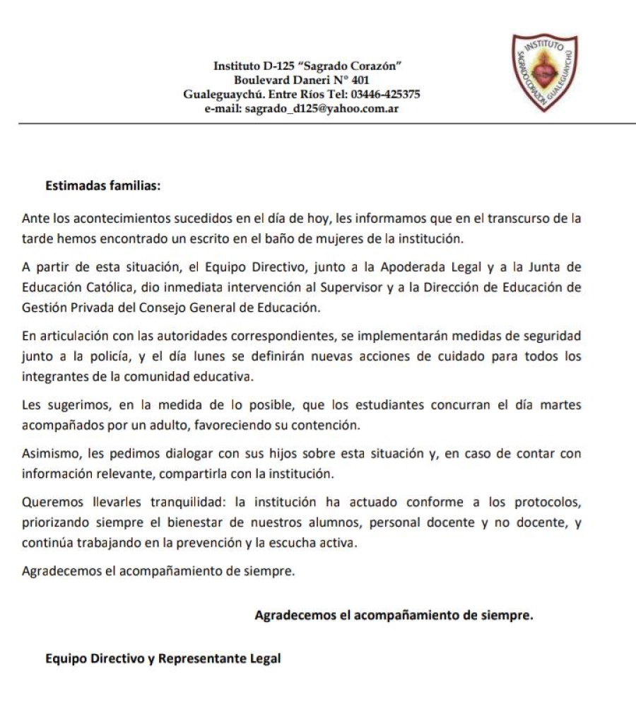 Desde el Instituto 125, Sagrado Corazón de Gualeguaychú, luego de que aparecieran amenazas en un baño, se comunicó a las familias que el martes se reiniciarán las clases, y los chicos deberán concurrir acompañados por un adulto.