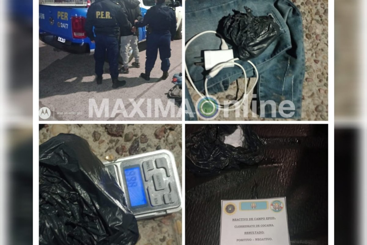 Ante la sospecha de tratarse de estupefacientes, se solicitó la presencia de la División Drogas Peligrosas, cuyos efectivos realizaron el test reactivo, obteniendo resultado positivo para clorhidrato de cocaína, con un peso total de 86,8 gramos.