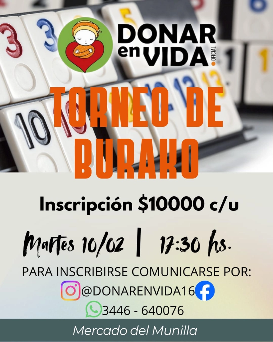 La ONG Donar en Vida organiza para el martes 10 de febrero un torneo de burako en el Paseo Munilla, con una inscripción de 10 mil pesos. Lo anunció en RADIO MÁXIMA Susana Olivera, a cargo de la institución benéfica.