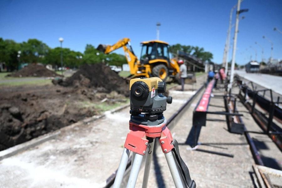 En el predio ya trabaja una retroexcavadora y palas cargadora que permiten agilizar los tiempos y dejar la superficie en condiciones adecuadas para las próximas etapas. Las cuadrillas técnicas también utilizan equipos topográficos de precisión para garantizar que el trazado y los niveles de base cumplan con los requerimientos de ingeniería establecidos.