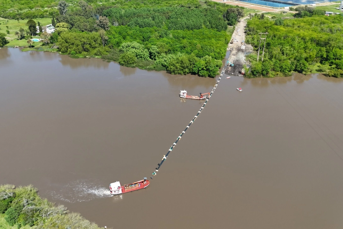 En el marco de la obra de optimización y ampliación de la planta de tratamiento de efluentes cloacales de Gualeguaychú, se realizó el hundimiento del emisario, una tubería de gran diámetro que transporta las aguas residuales tratadas hacia el río y las dispersa de forma controlada.