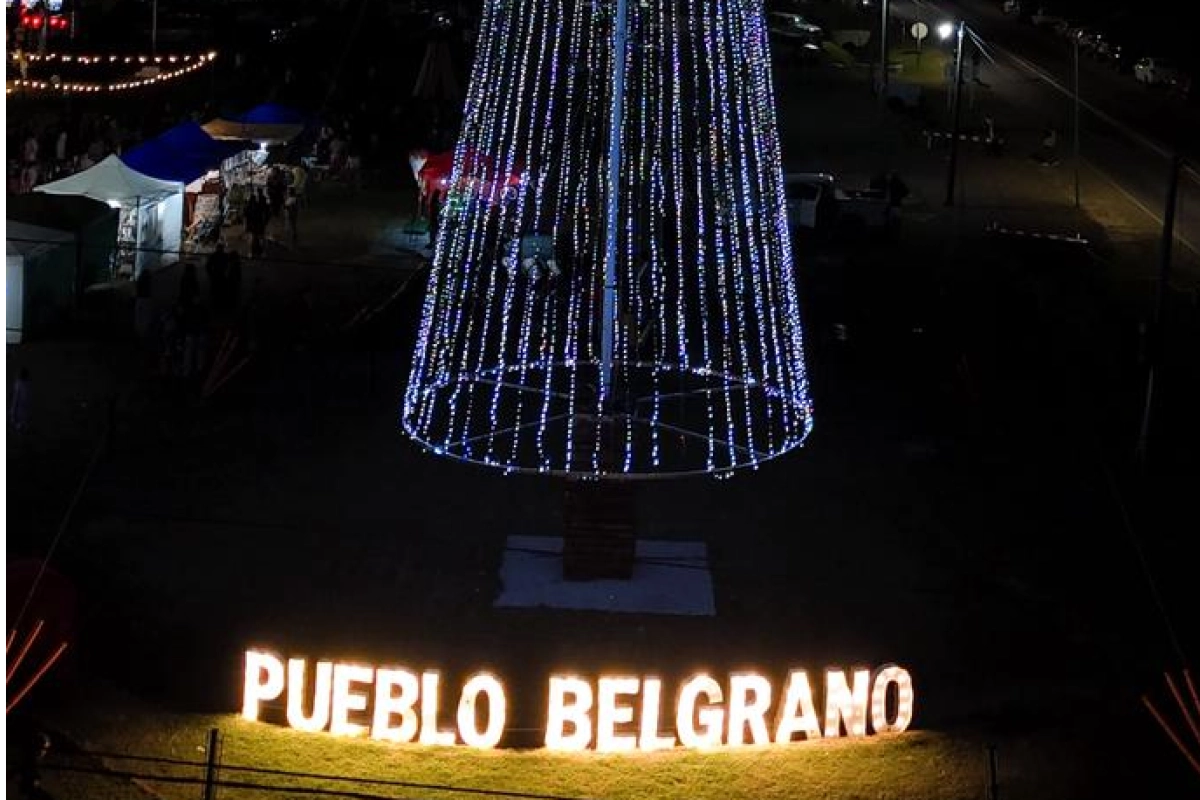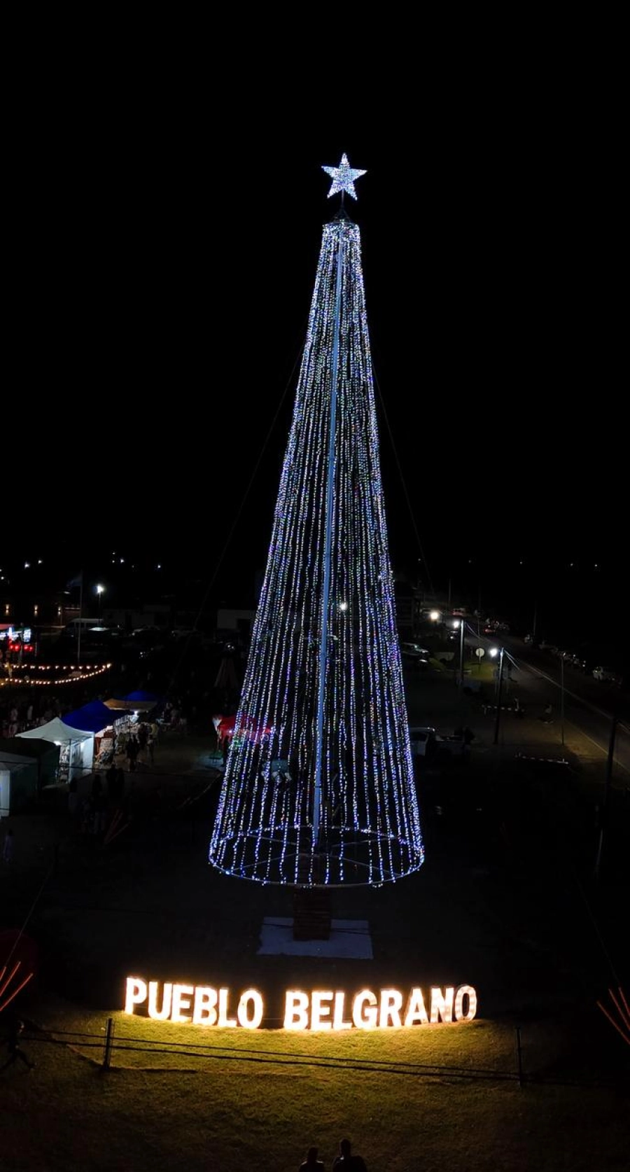 El árbol de Navidad de Pueblo Belgrano fue construido a nuevo luego de haber sido derribado por una tormenta en el verano pasado, con un gran trabajo del personal del departamento Electrotecnia de Pueblo Belgrano, tanto en la colocación de las riendas de luces como en el armado general del árbol.
