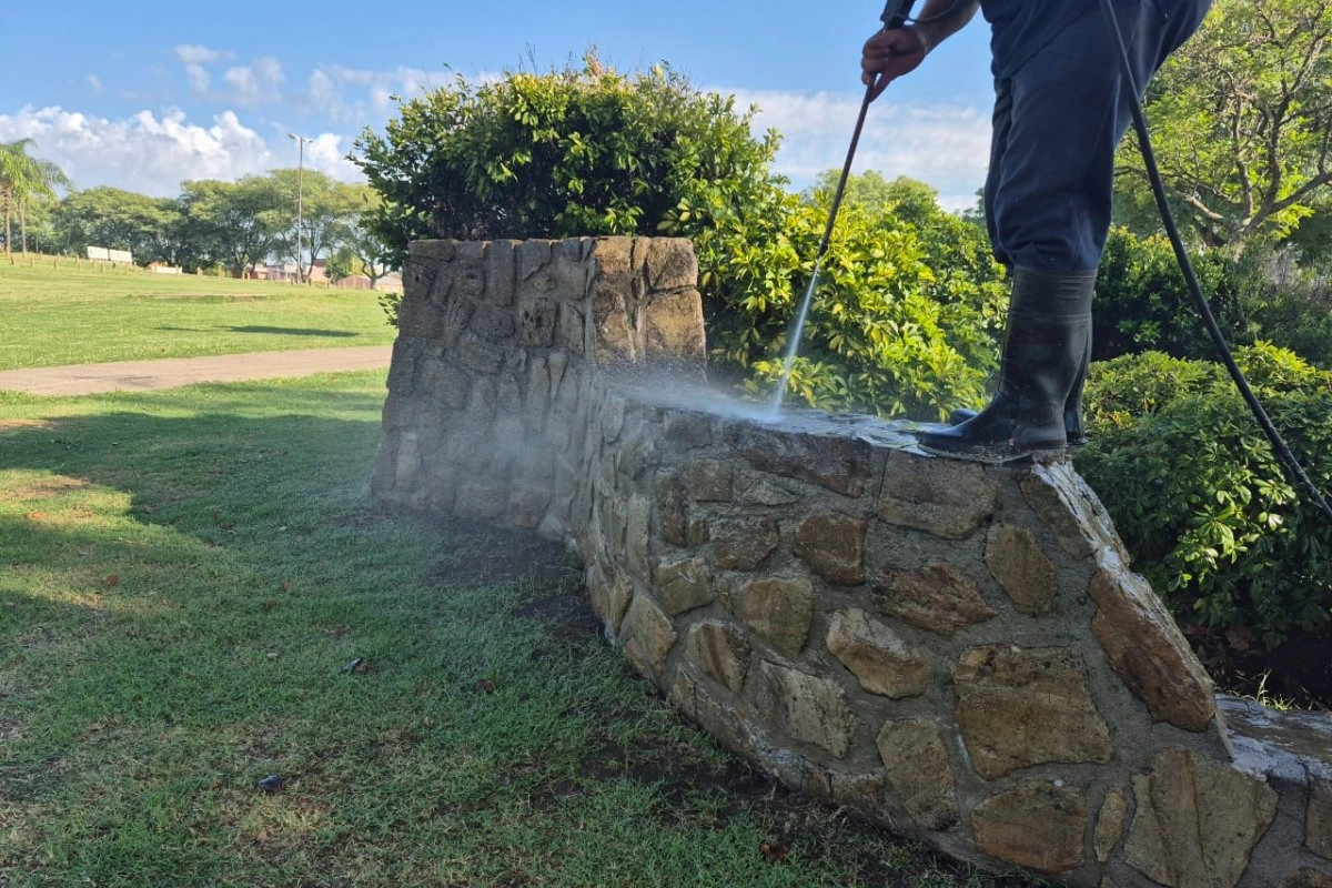 Con equipos de alta presión, el personal remueve suciedad acumulada, manchas oscuras producto de la humedad y grafitis que deterioraban la superficie. Además, el procedimiento permite recuperar la textura original de los muros y prolongar su vida útil sin afectar la estructura.