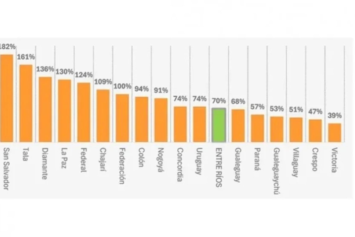 El estudio revela que, aunque todas las ciudades de la provincia experimentaron un incremento en los préstamos al sector privado en términos reales, el crecimiento fue desigual. San Salvador y Tala multiplicaron por seis los préstamos, mientras que ciudades como Victoria, Crespo, Villaguay y Gualeguaychú tuvieron aumentos más moderados, entre 3,3 y 3,6 veces.