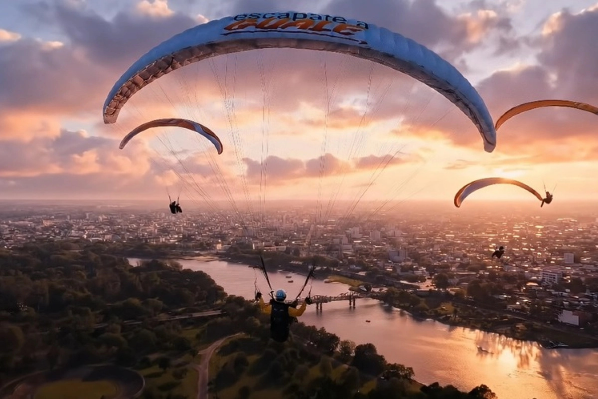 Así, los protagonistas, sintiendo la necesidad impostergable de escapar, se lanzan a volar metafóricamente en paracaídas y aterrizan plácidamente en Gualeguaychú, donde encuentran, muy cerca, un espacio de libertad, calma, paz y disfrute.