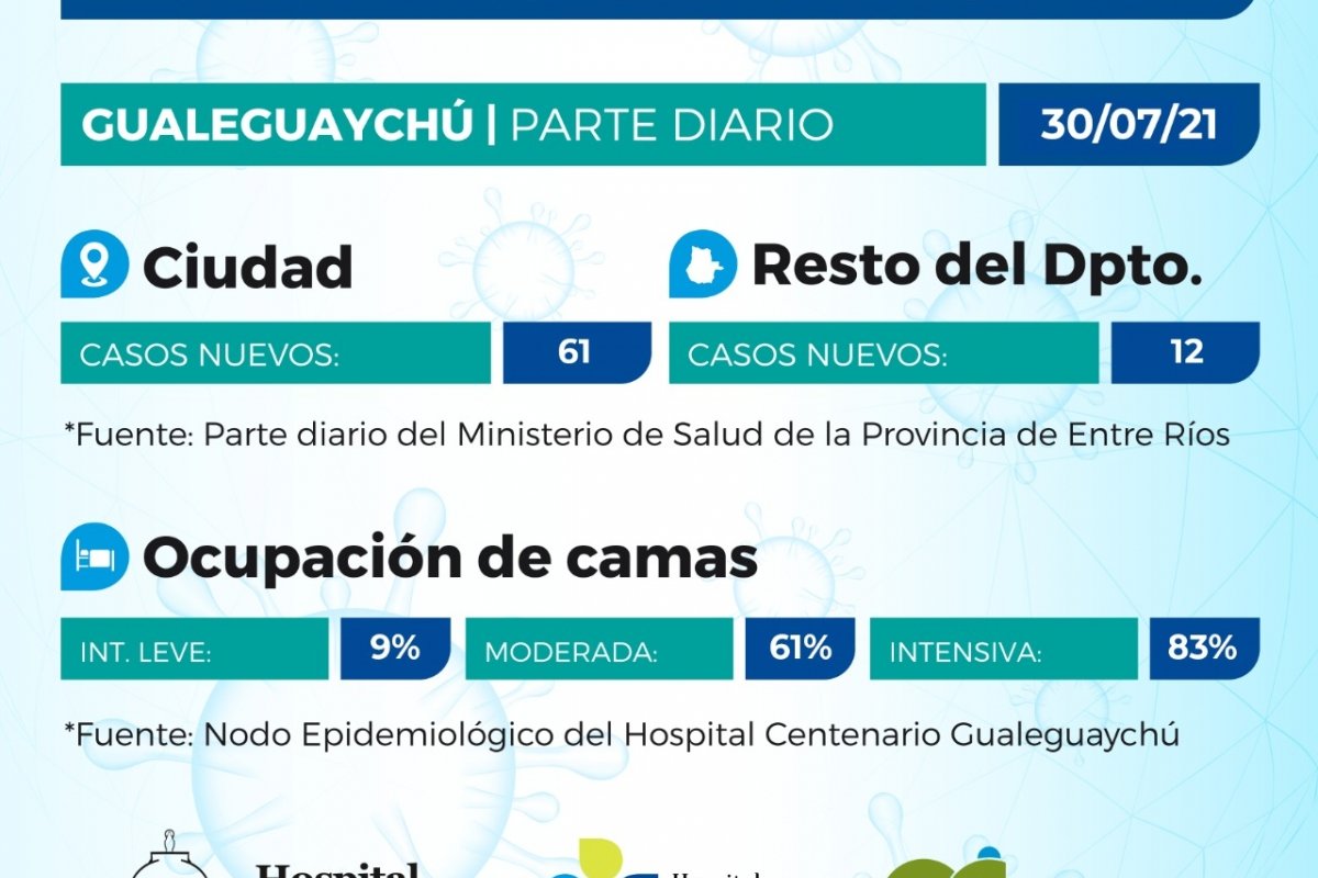 El Nodo Epidemiológico del Hospital Centenario informó que la ocupación en unidades de terapia intensiva es del 83%, en internación moderada es del 61%, y en internación leve (Sala E) es del 9%.