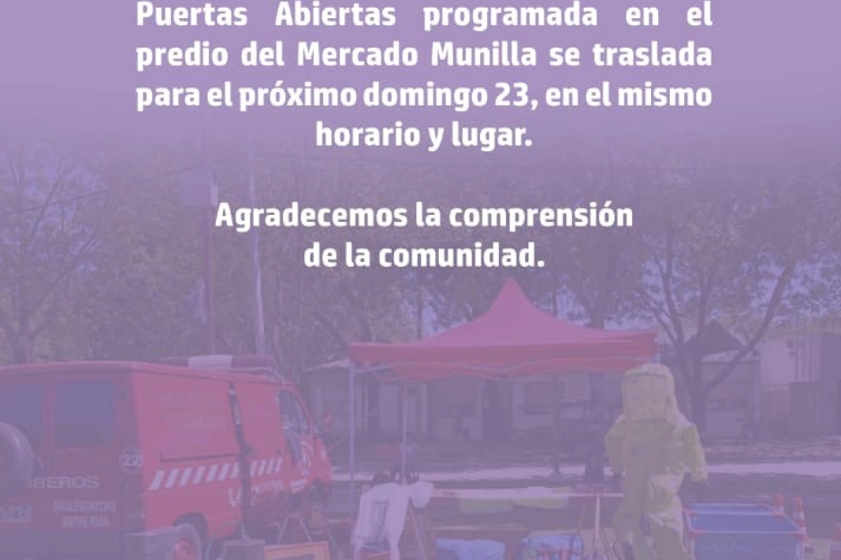 Debido a las condiciones meteorológicas anunciadas para este domingo, la Sociedad de Bomberos Voluntarios de Gualeguaychú anunció la suspensión de la jornada de puertas abiertas.