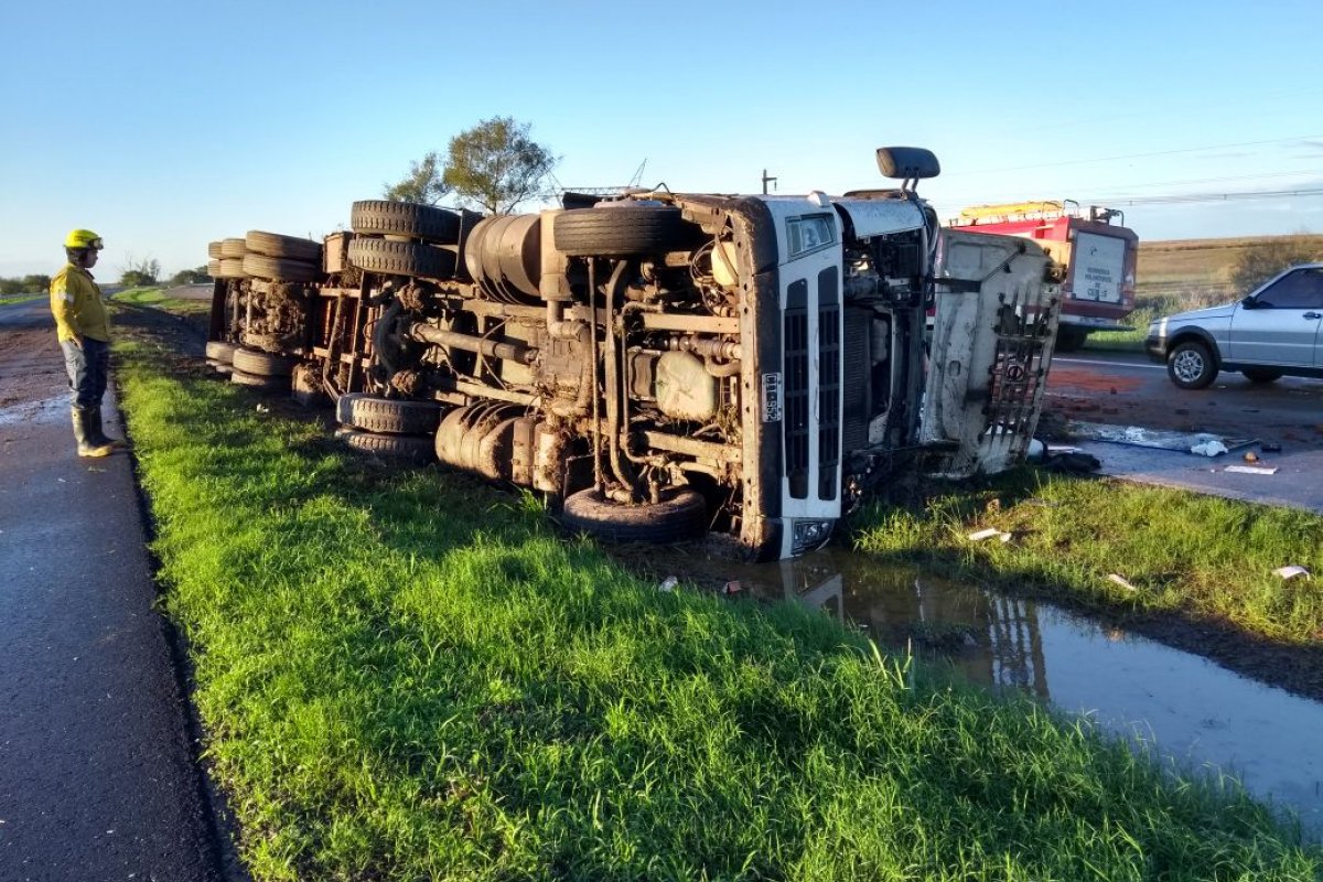 Este viernes se produjo un nuevo siniestro vial en la Ruta 12. Esta vez sucedió a la altura del kilómetro 150, donde, por circunstancias que se tratan de determinar, un camión Volvo FH12 que arrastraba un acoplado transportando una carga de mordió la banquina en dirección sur a norte y volcó espectacularmente, quedando apoyado sobre uno de sus laterales sobre el cantero central de la ruta.
