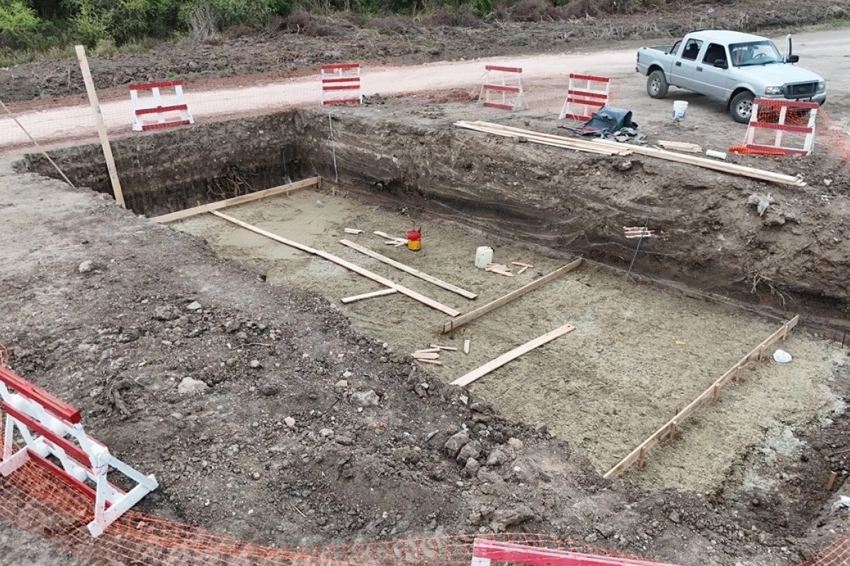 Las tareas comenzaron con una excavación de gran escala que permitió alcanzar la cota necesaria para la implantación de la estructura hidráulica. El movimiento de suelo generó un recinto rectangular de considerable profundidad que ya exhibe su base nivelada y preparada para la siguiente etapa constructiva.