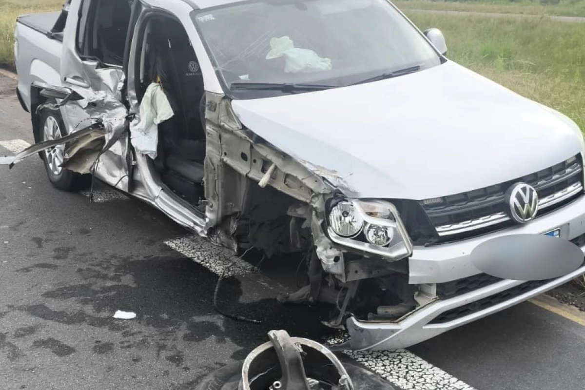 En el lugar, una camioneta Volkswagen Amarok que circulaba en sentido sur-norte, por razones que se tratan de establecer, perdió el control e impactó en la parte lateral izquierda de un camión Mercedes Benz con acoplado que transportaba ladrillos cerámicos, el cual se desplazaba en la misma dirección.