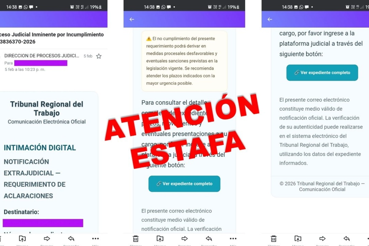 Dichas comunicaciones, que aparentan provenir de un inexistente “Tribunal Regional del Trabajo” o de un supuesto “Juzgado del Trabajo”, incluyen enlaces que conducen a falsos expedientes en trámite ante organismos laborales de la ciudad.