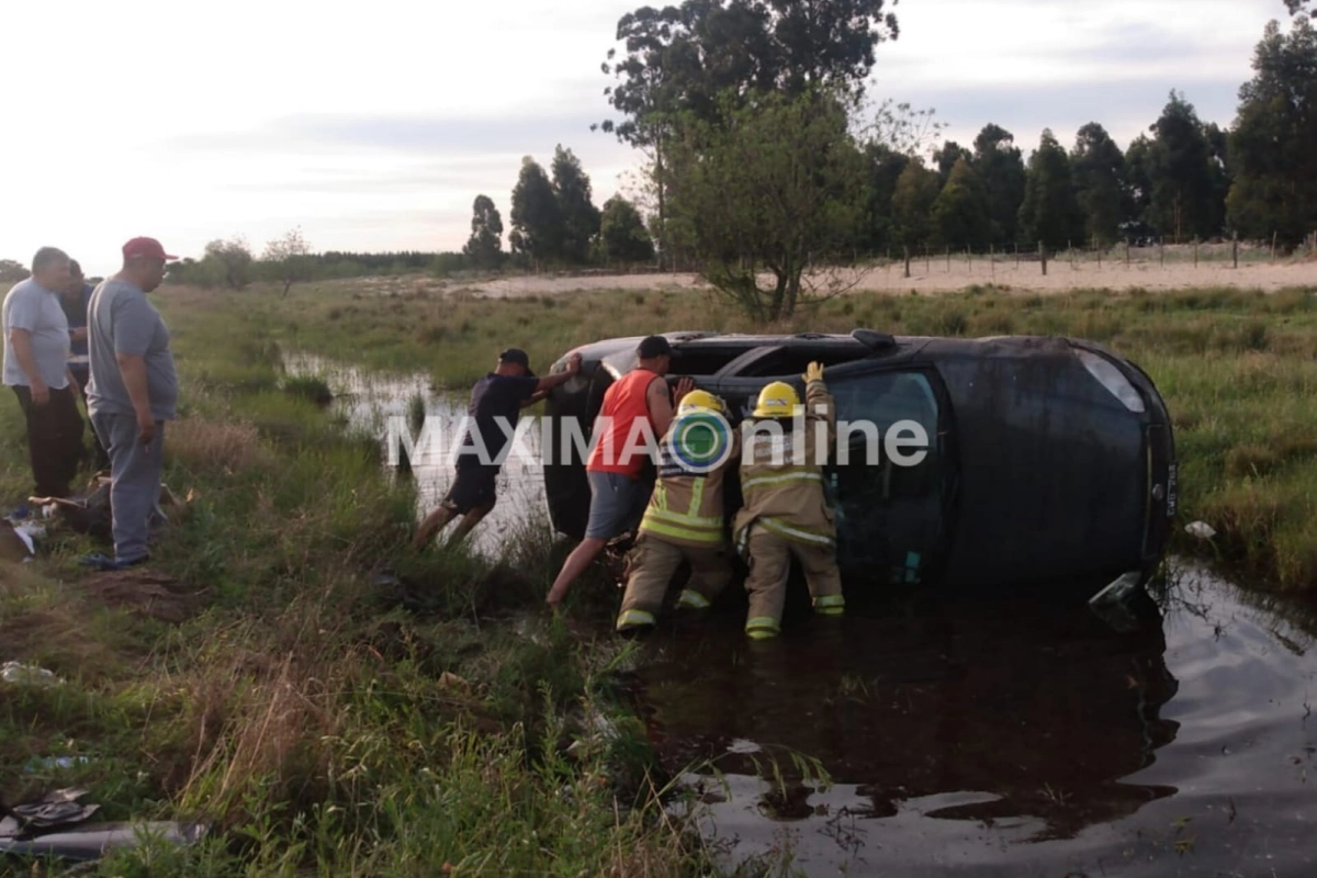 Pasadas las seis de la tarde de este viernes, una dotación del Destacamento Uno Médanos Móvil N° 8 de Bomberos, acudió al kilómetro 194 de la ruta nacional 12, por vuelco de un vehículo FIAT Siena con dos hombres de Lomas de Zamora (Buenos Aires), que viajaban hacia Victoria, entre Ríos.