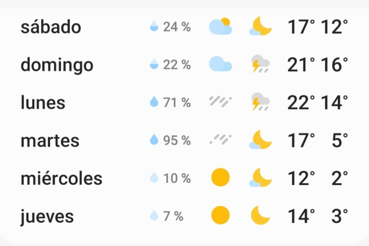 Por otra parte, anticipó que “llega una semana muy fría, con buen tiempo y sol pleno, con mínimas de 4 grados desde el miércoles y una sensación térmica aún menor”.