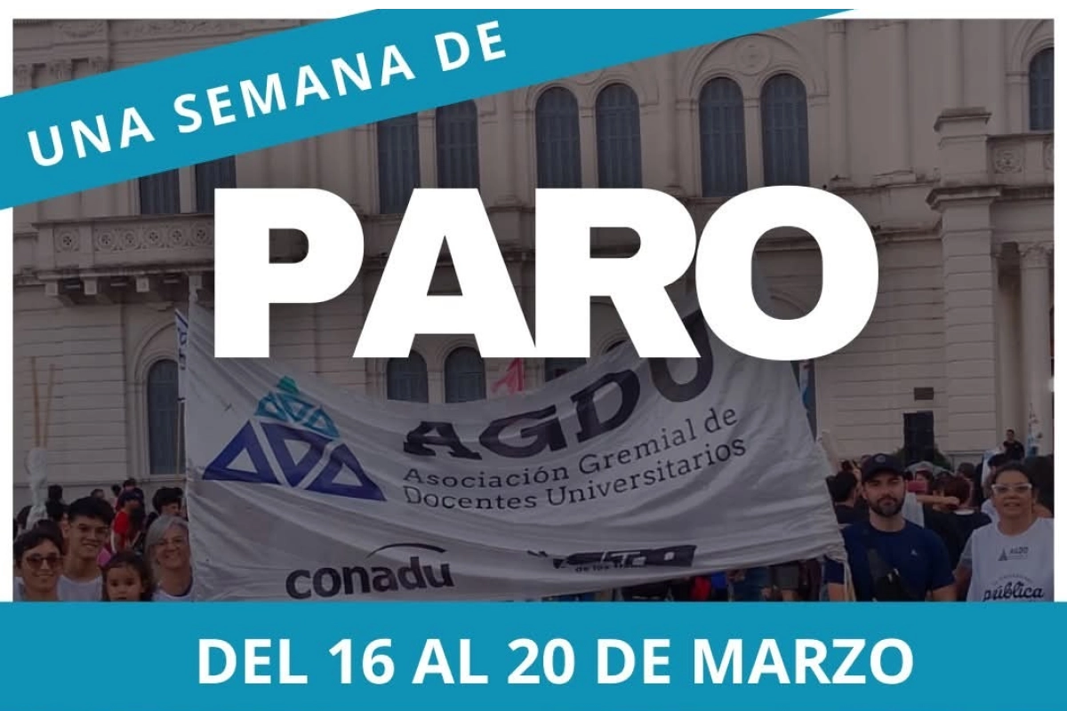 Las y los docentes universitarios afiliados a la Asociación Gremial de Docentes Universitarios (AGDU) y a la federación CONADU llevarán adelante un paro total de actividades entre el 16 y el 20 de marzo, en el marco de un reclamo por la situación salarial del sector y por el financiamiento del sistema universitario público.