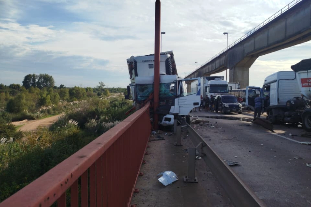 Un siniestro vial entre dos camiones se registró a la altura del km 110 de la autovía de Ruta Nacional N°12, sobre el puente General Urquiza.