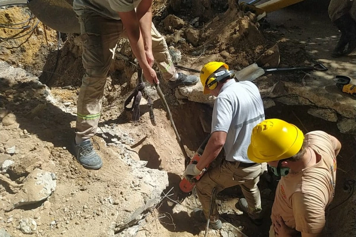 La intervención demandó la utilización de equipamiento específico, que incluyó cortadoras de pavimento con disco diamantado para apertura de calzada, martillos neumáticos para la remoción de material consolidado, retroexcavadoras para la extracción de suelo y herramientas manuales para tareas de precisión en sectores de difícil acceso.