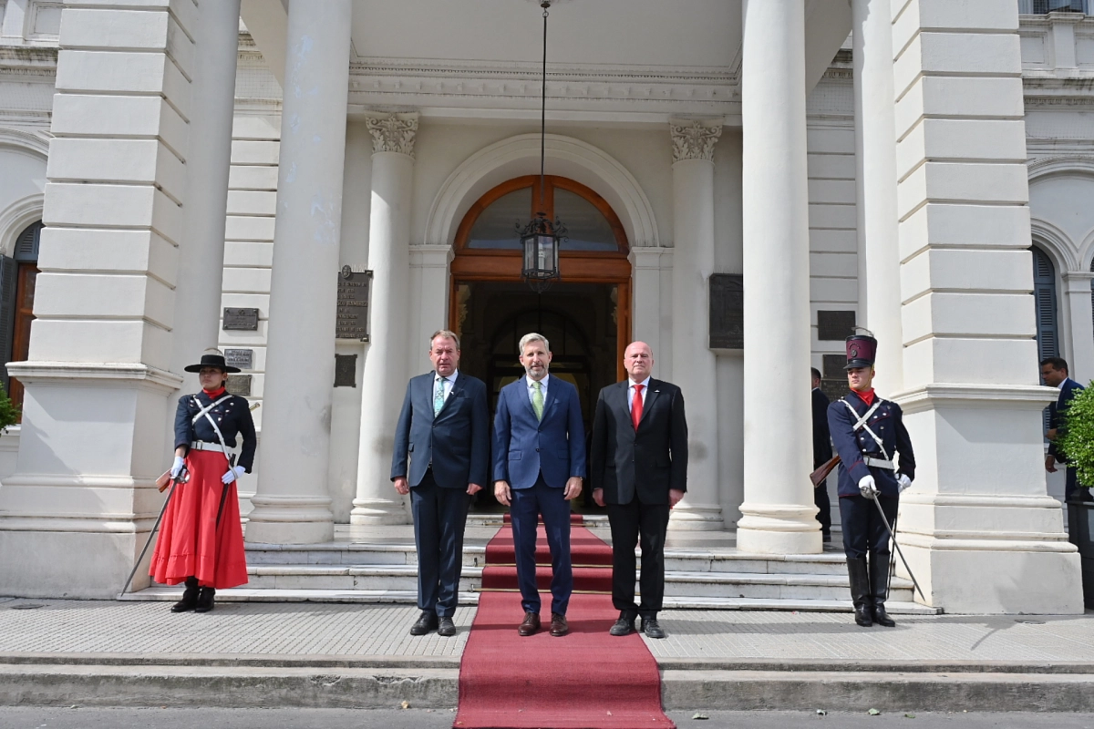 El gobernador Rogelio Frigerio recibió este viernes en Casa de Gobierno al embajador de Alemania en Argentina, Dieter Lamlé, y a autoridades del Estado Libre de Baviera, con quienes mantuvo una reunión bilateral junto al gabinete provincial. Más tarde, participaron del acto por el 200° aniversario de la inmigración alemana en Argentina.