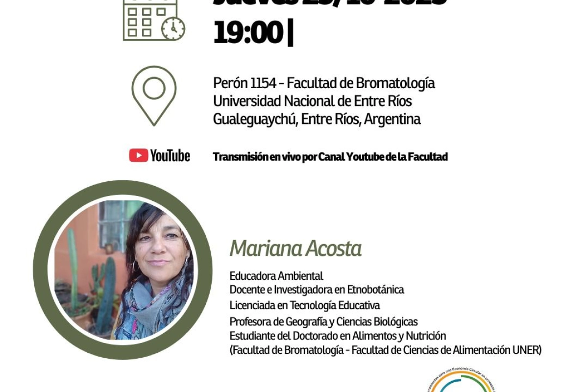 La disertación estará a cargo de Mariana Acosta, Educadora Ambiental, Docente e Investigadora en Etnobotánica, con una destacada trayectoria en el ámbito de la Educación Ambiental y la investigación sobre especies vegetales silvestres y no convencionales de la región neotropical. Es Licenciada en Tecnología Educativa, Profesora de Geografía y Ciencias Biológicas y actualmente cursa el Doctorado en Alimentos y Nutrición (Facultad de Bromatología - Facultad de Ciencias de Alimentación UNER).