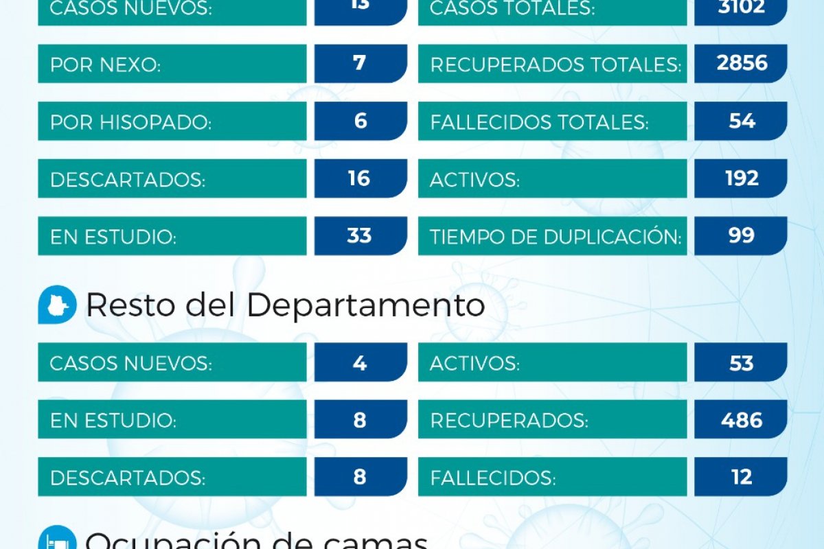 De los 3102 contagiados desde el inicio de la pandemia en la ciudad, 192 continúan cursando la enfermedad y 54 personas fallecieron. Hay 33 casos en estudio en nuestra ciudad