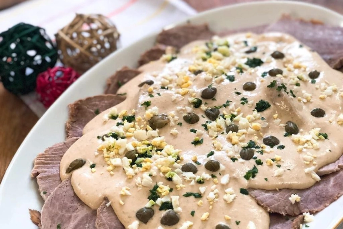 4. Para presentarlo ponemos un poco de la salsa en una fuente o plato, las fetas de carne, cubrimos con un poco más de salsa, ponemos por arriba huevo duro rallado, perejil picado, alcaparras o aceituna verde picada y se lleva a heladera, tapado para q no se reseque el huevo, hasta el momento de consumir.