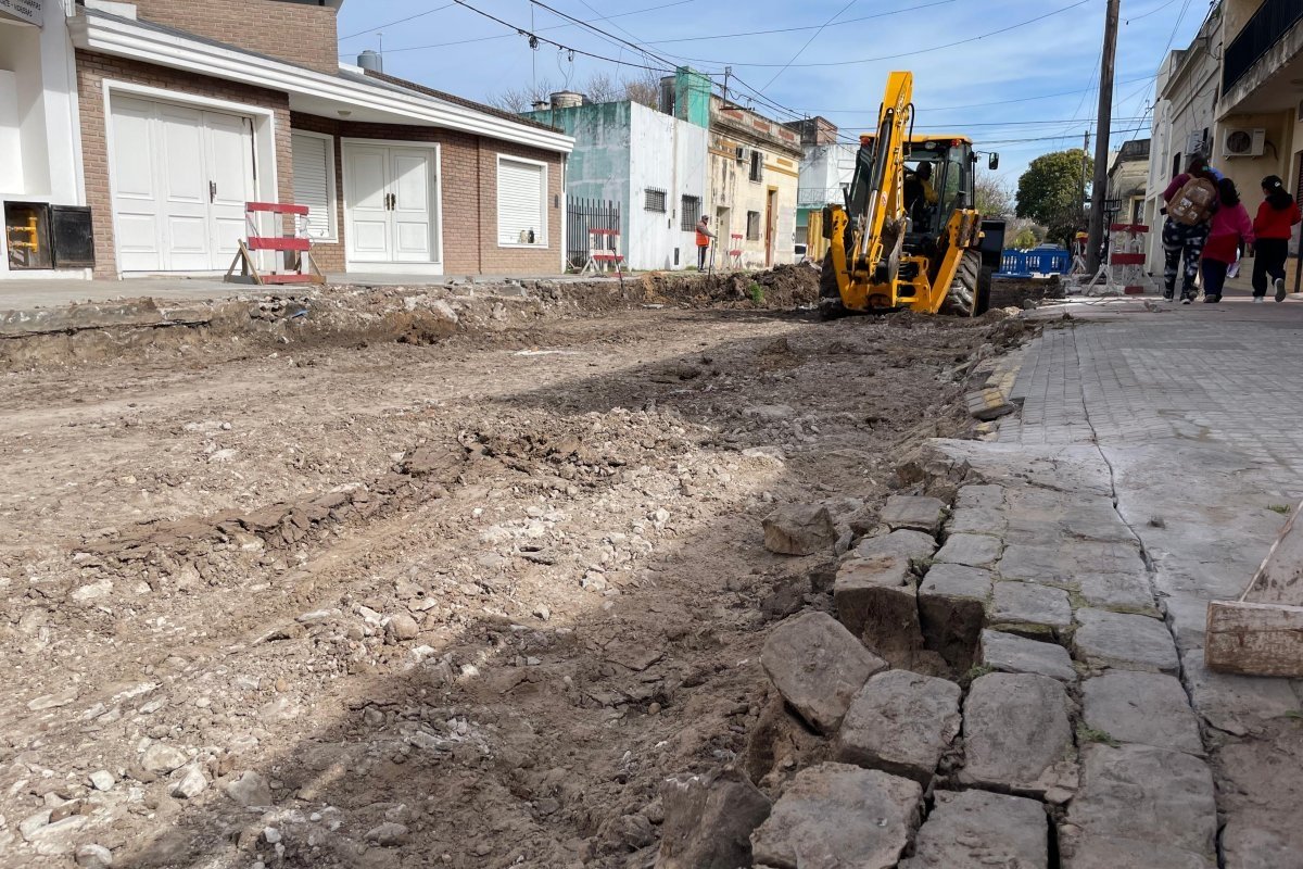 Luego de la primera etapa de los trabajos, durante la cual la cuadrilla de la Secretaría quitó los adoquines que estaban ubicados sobre el caño de agua que alimenta a los domicilios de esa cuadra, los que serán conservados para su uso futuro en estructuras ornamentales.