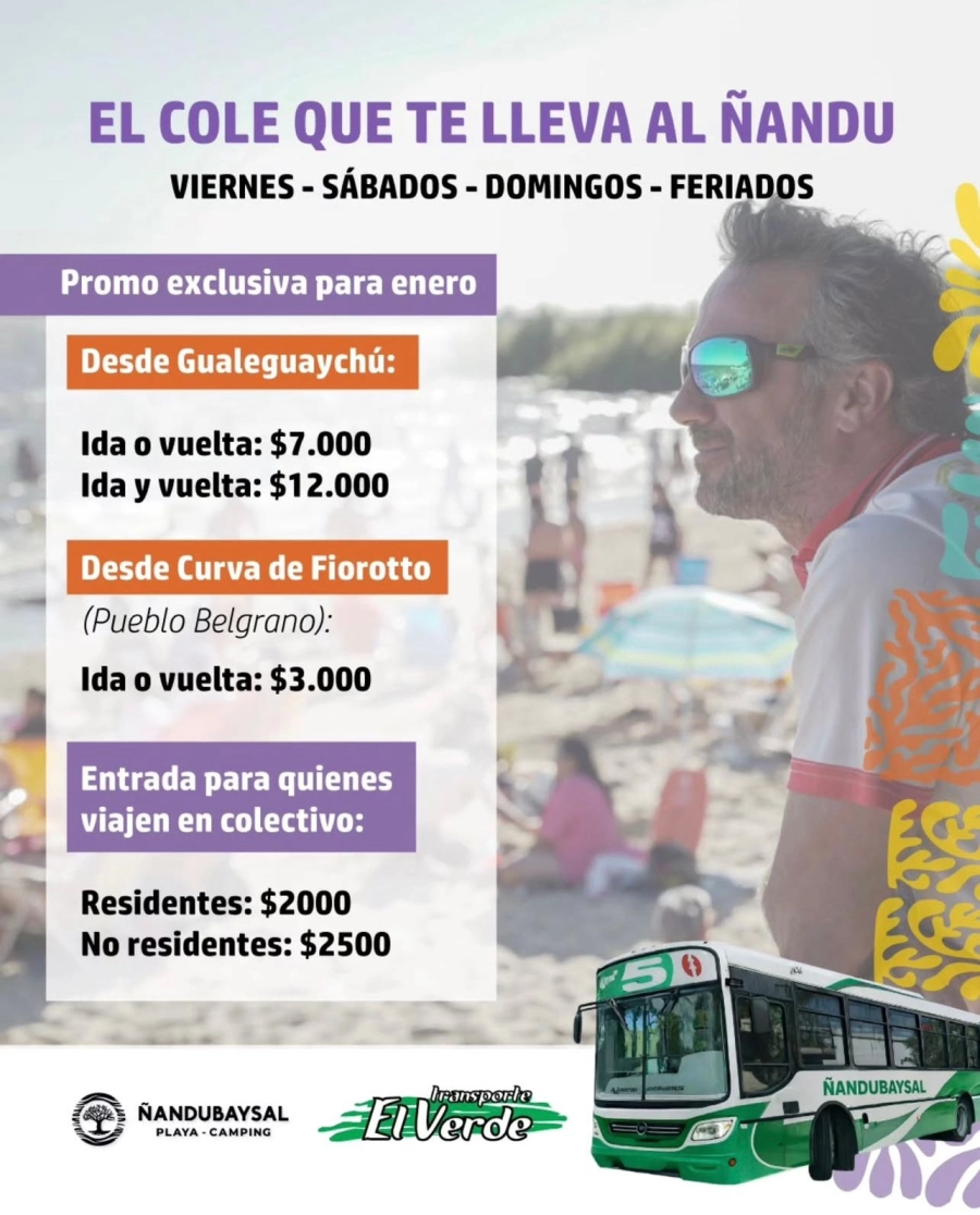 La línea El Verde SRL llega hasta el balneario, los días viernes, sábados, domingos y feriados, con promociones de tarifa durante el verano.