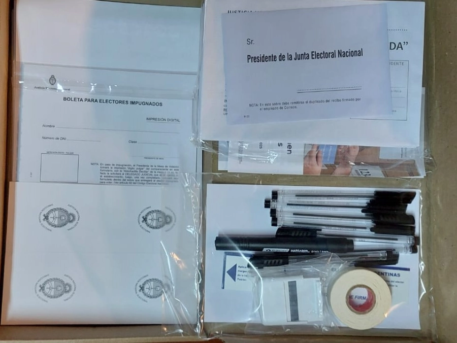 También se incorporan precintos, credenciales para las autoridades de mesa y una caja de útiles con bolígrafos indelebles, cinta adhesiva, fibrones, sellos, reglas, fajas de seguridad, normativa electoral y sobres para los distintos procedimientos previstos durante la jornada (boletas reemplazadas, votos recurridos e impugnaciones de identidad).