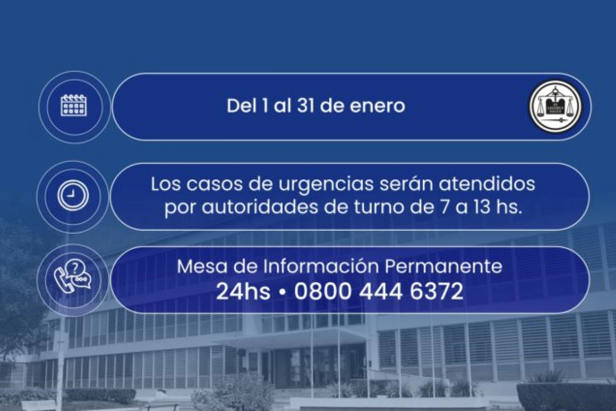 Cesarán en ese lapso las actividades ordinarias del Poder Judicial de Entre Ríos. Pero los casos de urgencia serán atendidos por integrantes de la magistratura, del funcionariado y empleados/as que prestarán servicio durante toda la mañana, en el habitual horario de 7 a 13. Además, se podrán efectuar consultas telefónicas gratuitas a través de la línea de alcance nacional para atención ciudadana: 0800-444-6372.