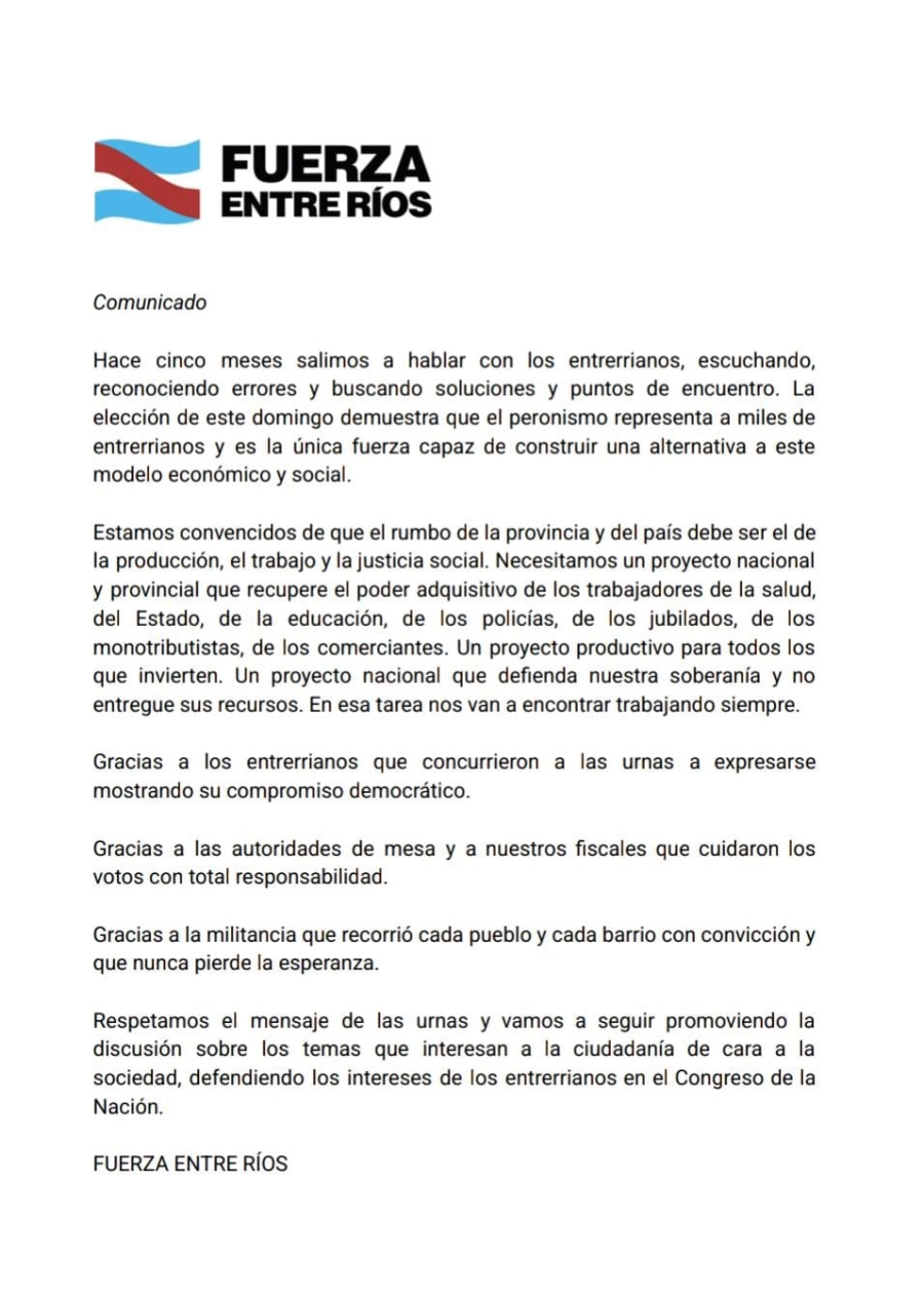Respetamos el mensaje de las urnas y vamos a seguir promoviendo la discusión sobre los temas que interesan a la ciudadanía de cara a la sociedad, defendiendo los intereses de los entrerrianos en el Congreso de la Nación.