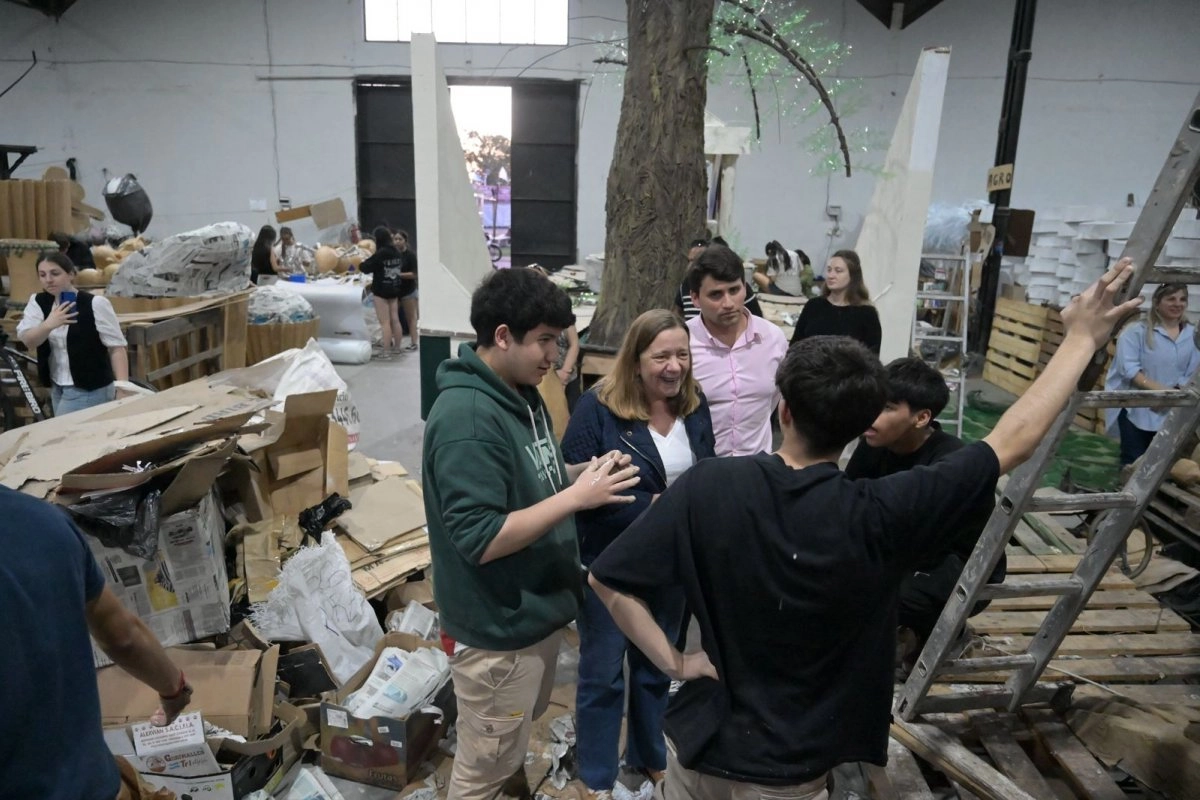 En los Galpones, donde 30 carrozas toman forma para el Desfile del próximo 11 de octubre, Berisso dialogó con los jóvenes sobre su esfuerzo creativo, acompañada por el secretario de Desarrollo Humano, Juan Ignacio Olano; el subsecretario de Cultura, Luis Castillo; la responsable de Juventud, Ana Severín, y el concejal Juan Pablo Castillo.