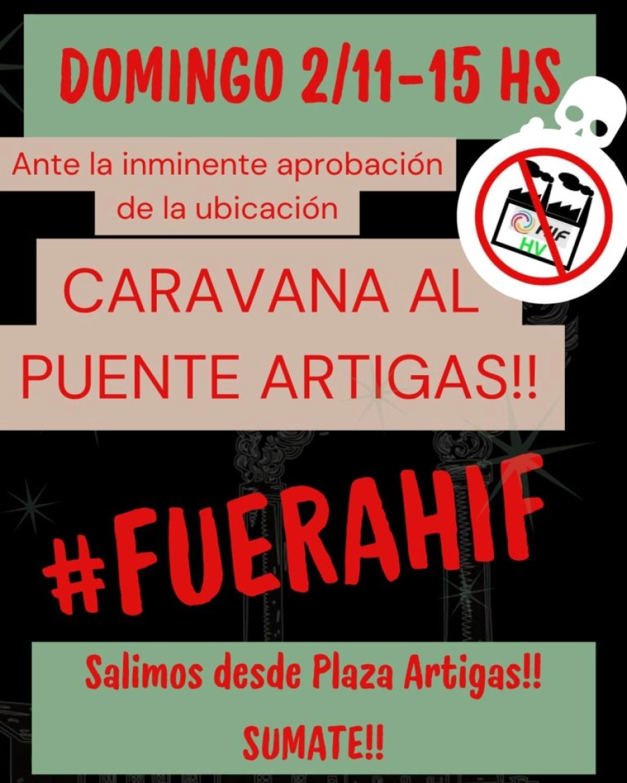 Por este motivo, el domingo nos convocamos a realizar una caravana hacia el puente Artigas. En auto, en moto, en bici, caminando. Nos convocamos a partir de las 15 hs en Plaza Artigas. No faltes, se hace necesaria tu participación”, anuncia la placa difundida por vecinos de Colón, ciudad costera del río Uruguay, en Entre Ríos.